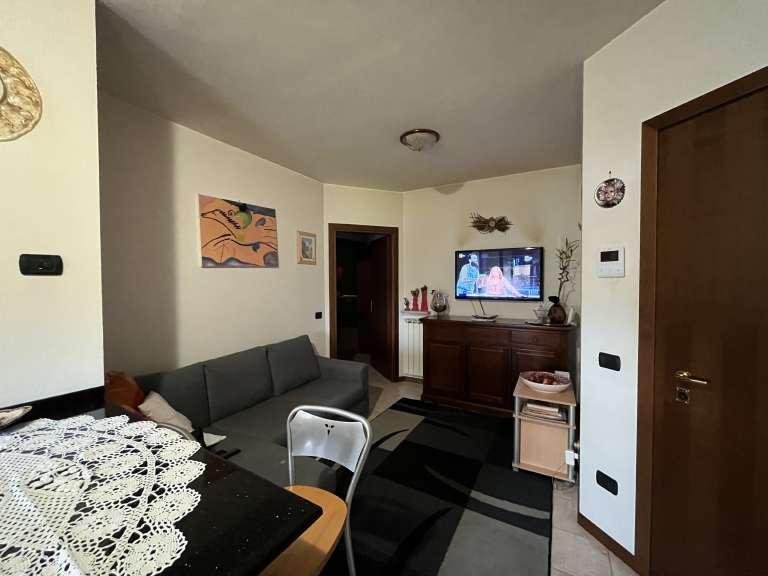 L'appartamento si trova al primo piano del condominio "Condominio Sole", accessibile tramite la scala B. È composto da un ingresso-soggiorno con angolo cottura, una camera matrimoniale e un bagno cieco. Inoltre, l'appartamento include una cantina al piano interrato, un locale ad uso deposito al piano interrato e un box auto al piano interrato, tutti di piena proprietà.